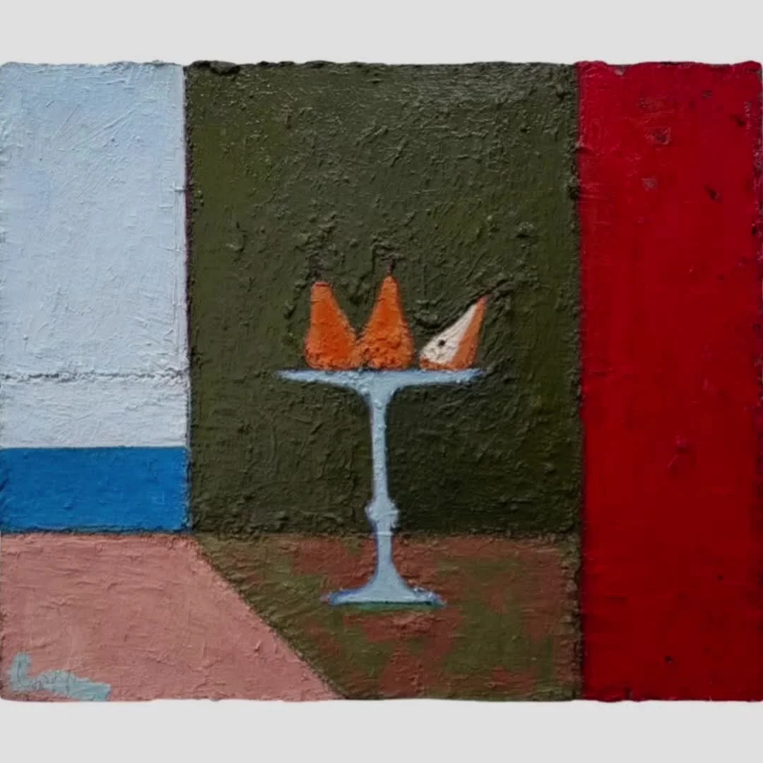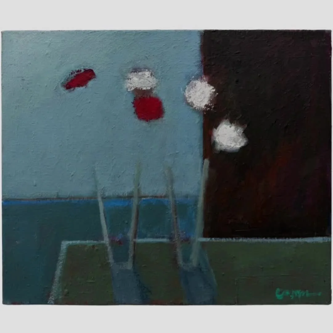 Chris Capper’s meditative paintings offer a space for contemplation and reflection. His evocative compositions are careful considerations of form and space, yet are not committed to precise definition. Vibrant orbs imply flowers, while interiors are mapped in abstracted geometry, both recurring motifs throughout his works