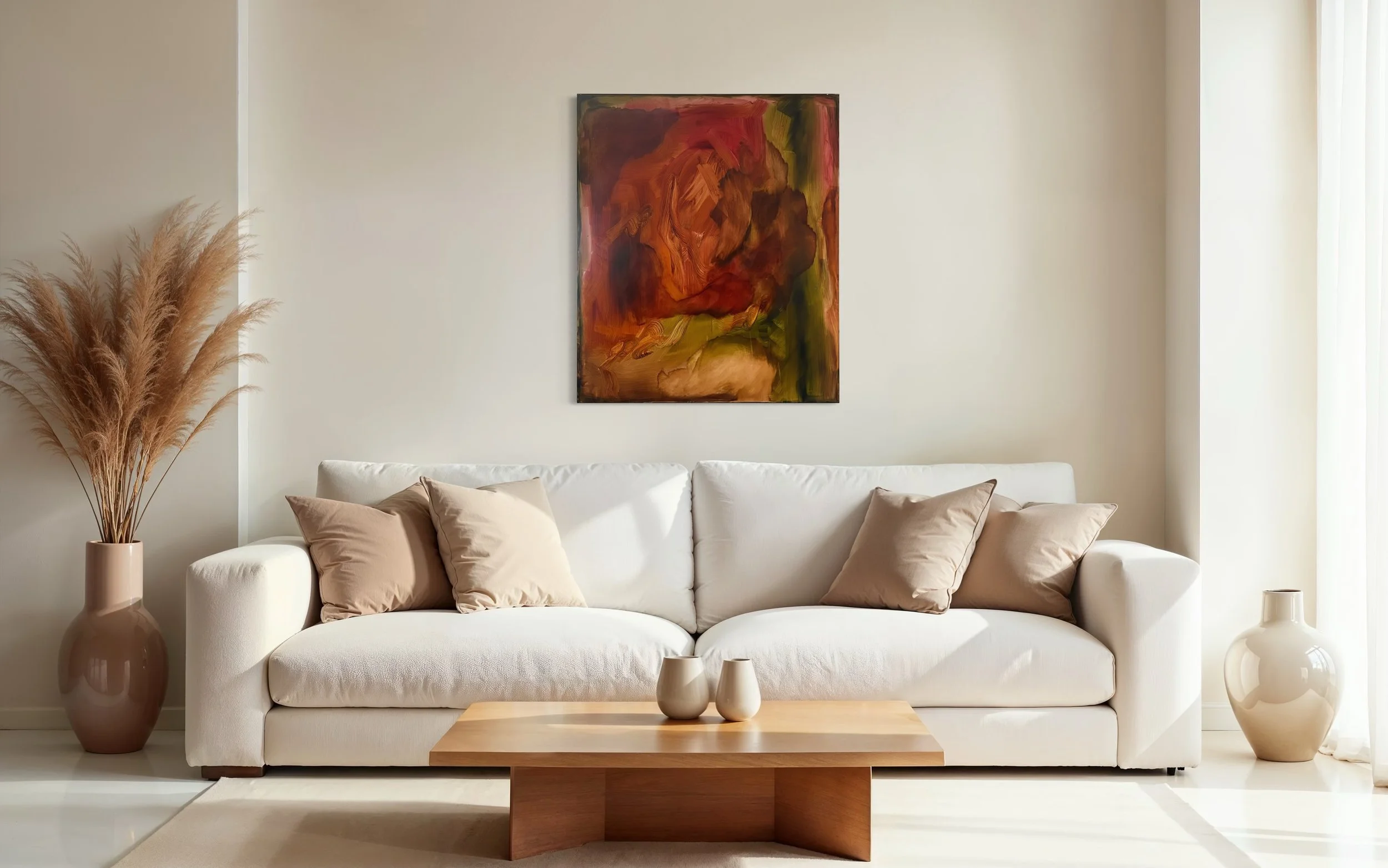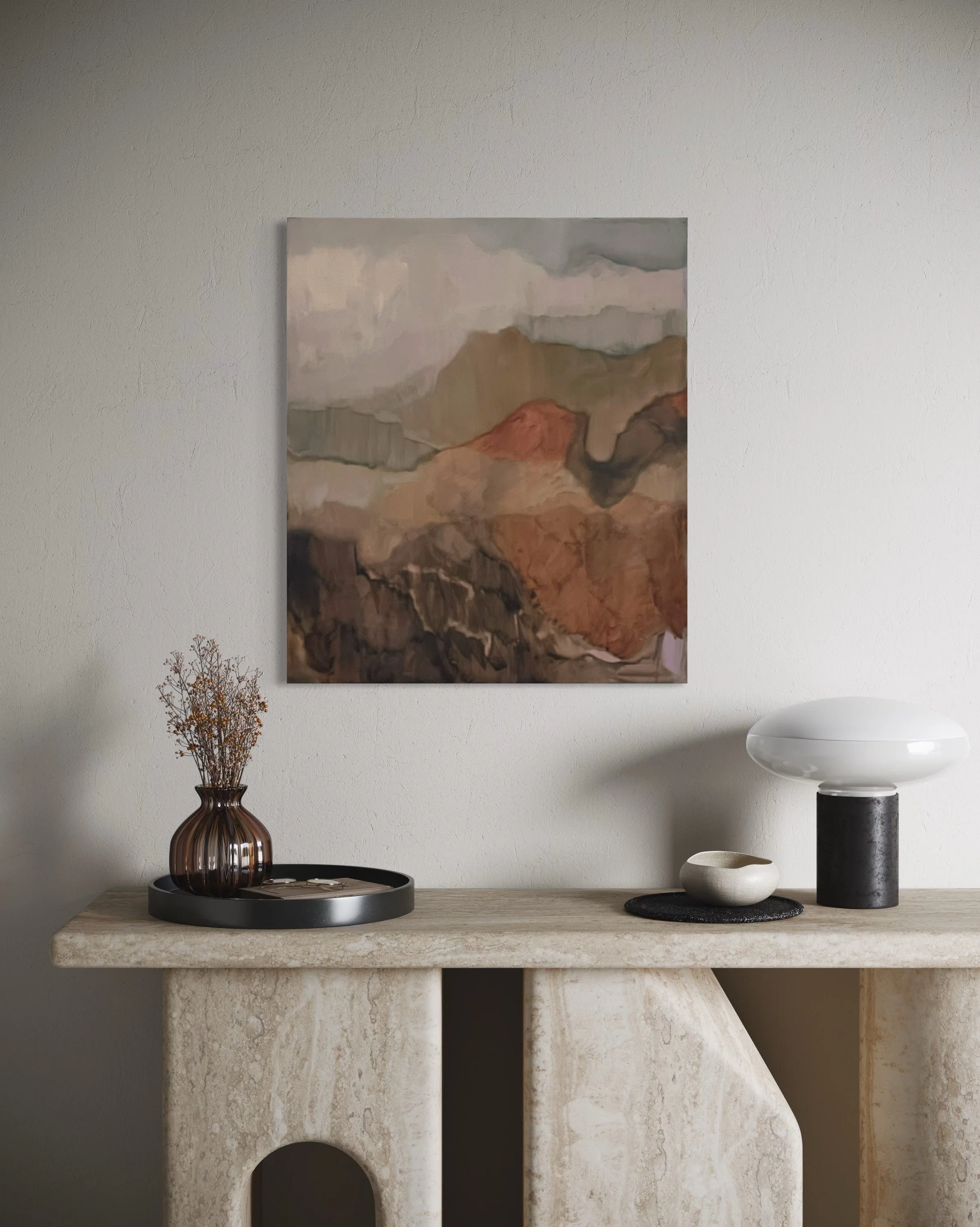 Through dynamic brushstrokes and experimental surfaces, her work captures the tension between containment and expansion, memory and change.